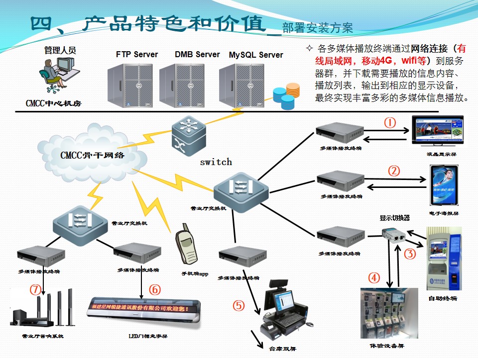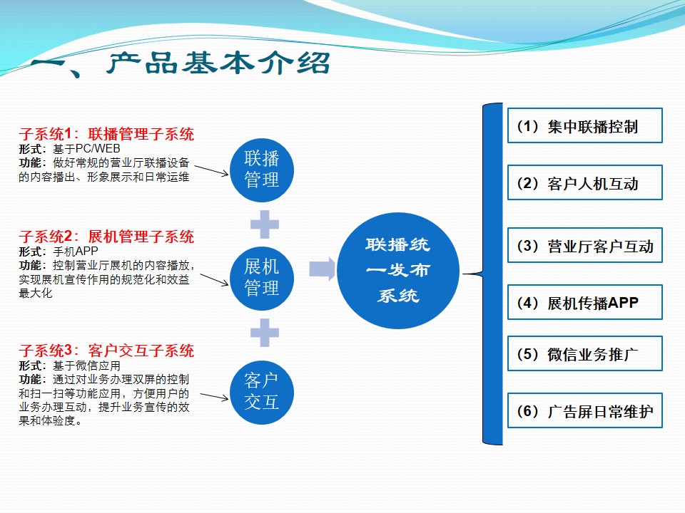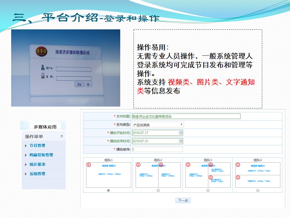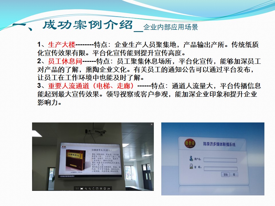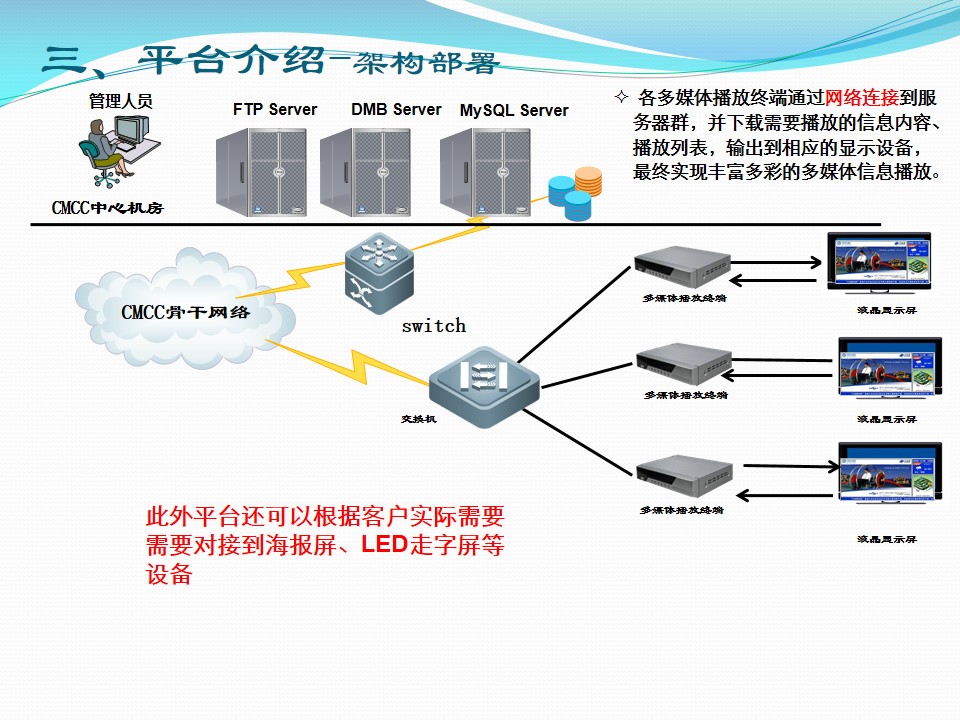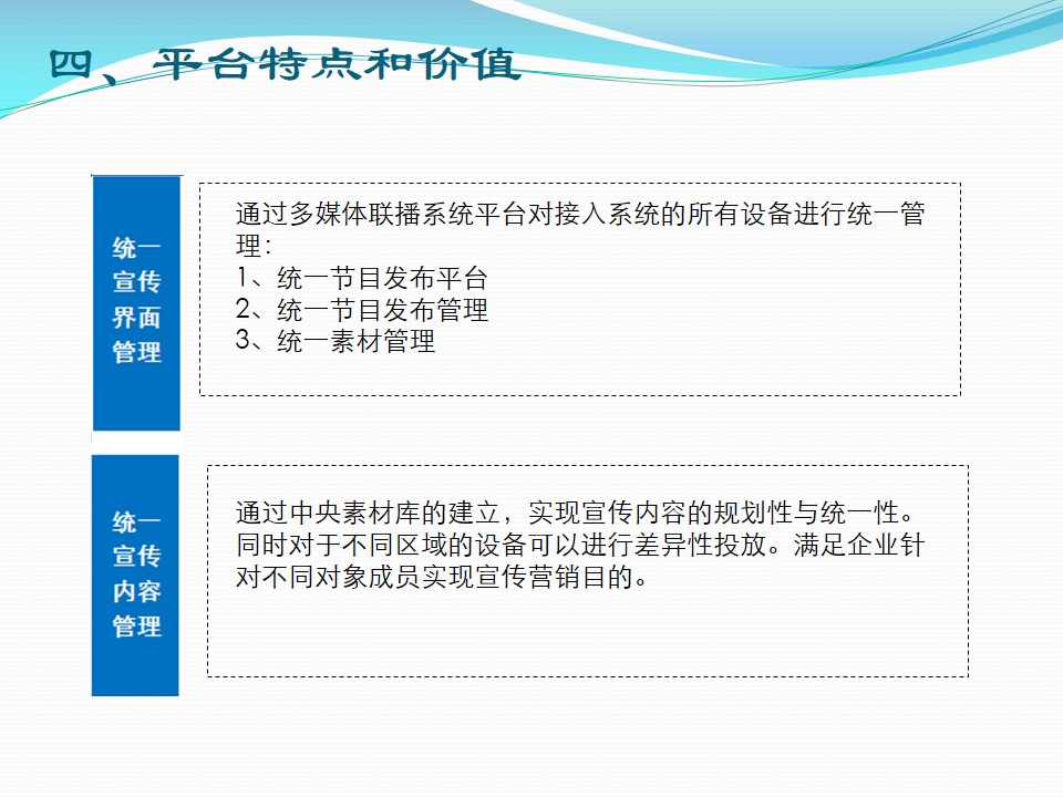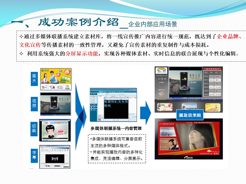 统一的多媒体联播体系,实现媒体信息的发布、排期、定时播放、监控等,不限于电视机、海报屏和LED屏等。